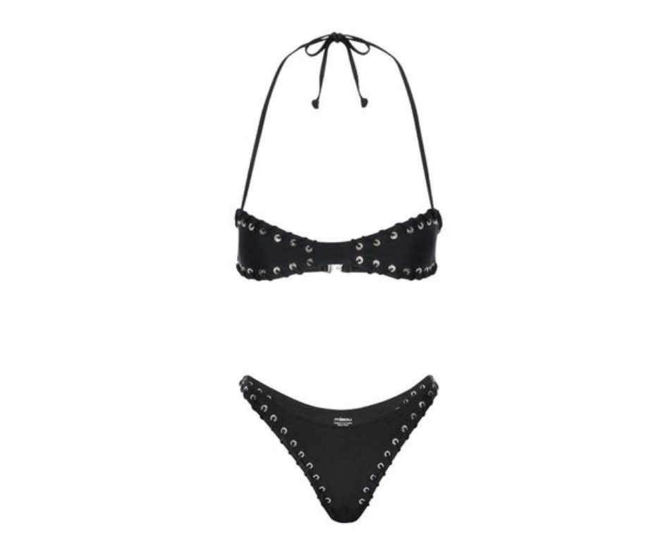 This stunning bralette is the perfect accessory to your next outfit. Completed with chrome circular studs against our black vita fabric. Wear straight from the pool to the bar with some jeans, linen or suit pants. Simple but effective details with a thin strapped back.